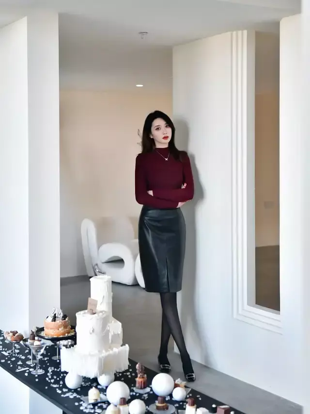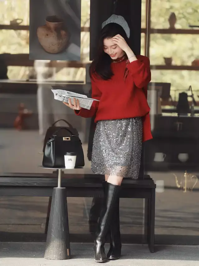 第三章节,毛衣搭配膝下裙,更优雅大气Tips①:红色毛衣搭配亮片直筒半身裙,遮肉显瘦