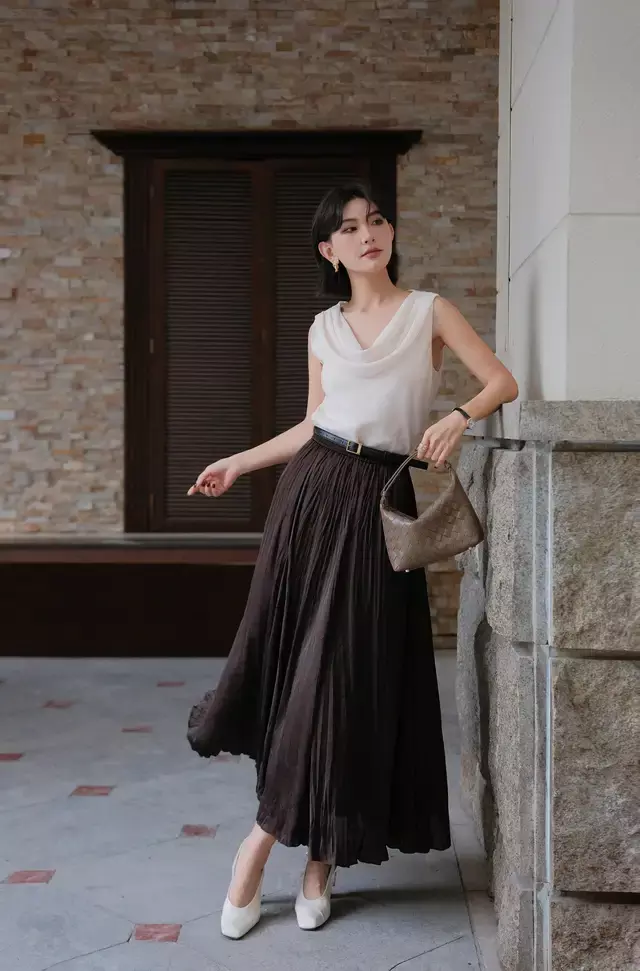 为何穿裙子用皮质的单鞋来穿搭?原因很简单,更容易提升气质,有一种轻熟风的视觉效果,沉稳又大方。