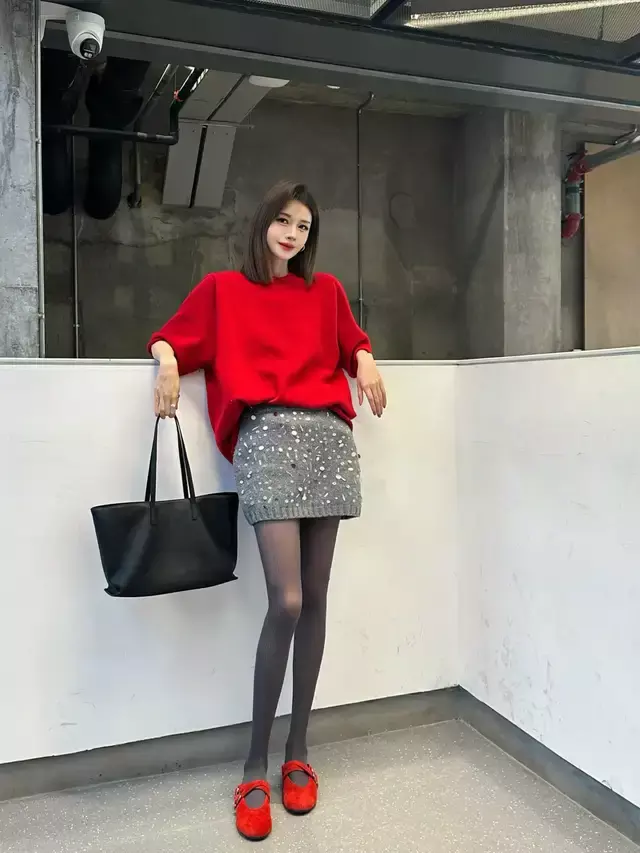 还有几天时间就过年了,想让自己的打扮更喜庆,可以直接选择一件红色的毛衣来搭配上灰色的针织短裙,内搭一条保暖丝袜和一双红色的玛丽珍鞋,正好和红色的毛衣色彩形成呼应,让整体配色更协调。