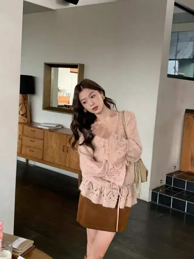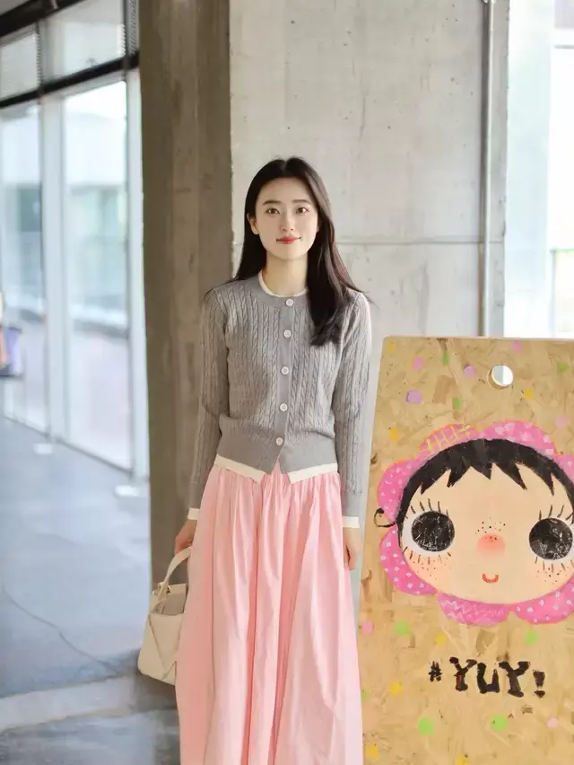 Tips④:灰色针织开衫搭配粉色半身裙,少女感十足
