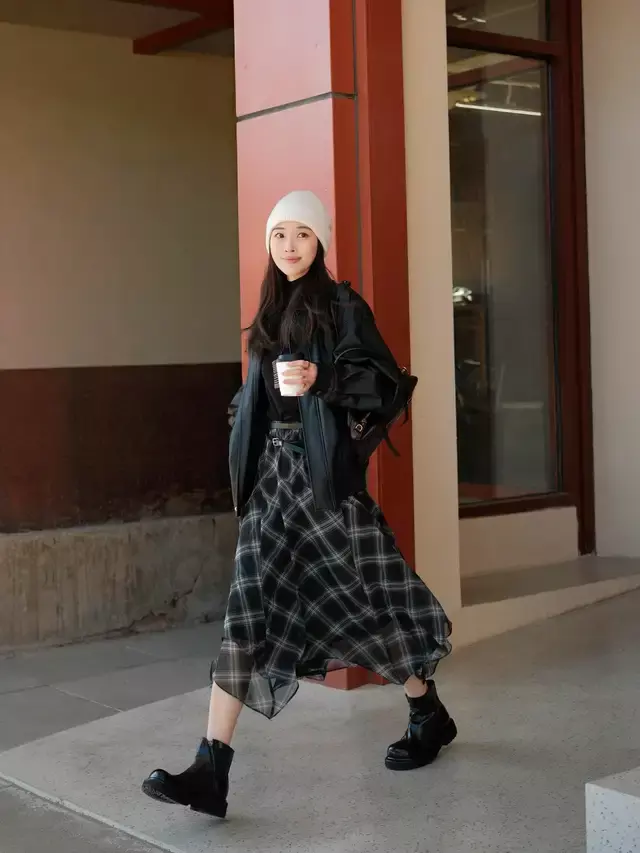我们选择鞋子的时候也要根据自己的穿衣风格来决定,比如说上面这位时尚博主,用了比较酷的黑色皮衣外套搭配上格纹的散装半身裙,那么我们就要选择一双圆头的黑色马丁靴来组合,才能让造型变得更酷、更飒、更美,有一种叛逆的时尚风。