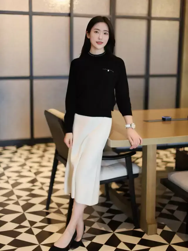 担心自己的穿搭过于张扬,想要低调一点,可以选择的最为经典黑白色彩组合。就比如上面这位时尚博主,就用了黑色的毛衣搭配上白色的缎绸面料直筒半身裙,脚要穿黑色的浅口高跟单鞋,这样的打扮既优雅又大气。