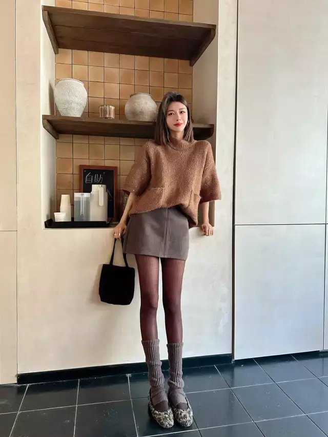 下半身直接选择一条棕色的直筒短裙来穿搭就够,脚上踩着一双同色系的中筒靴,就能让你变得简约时尚又灵动。