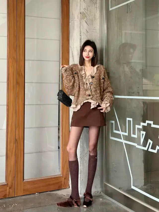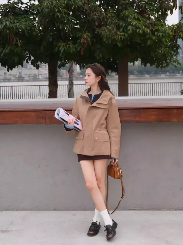 不想自己的穿搭过于沉闷枯燥,可以选择一件大地色系的夹克外套,内搭一件藏蓝色的针织开衫,叠穿蓝色衬衫和一条棕色的短裙,这种暖色系的搭配确实更显年轻,更显活力感。