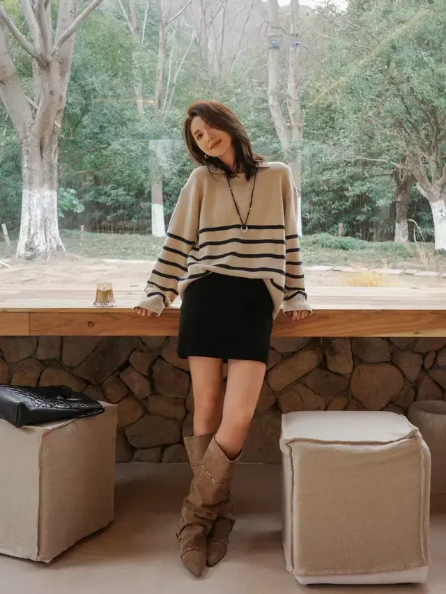 单穿的时候最不可或缺的就是一件毛衣了,不过我们也要选择经典的款式,色彩不能花哨。例如上面这一件条纹的针织毛衣搭配黑色的短裙,脚上穿了一双大地色系的中筒靴,就变得温柔大气。选择的衣服设计,腰间要留有余量,穿在身上更遮肉。