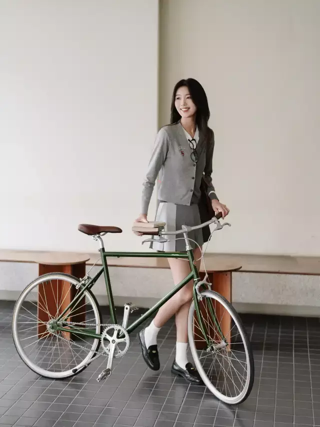 年轻貌美的你拥有高挑身材和纤细的大长腿,不妨可以尝试用灰色的 V 领针织开衫,搭配上一条压褶 A 字短裙,脚上穿了一双黑色的乐福鞋,这样的打扮真的很适合 00 后的美少女,让你看起来更有活力,少女感爆棚。