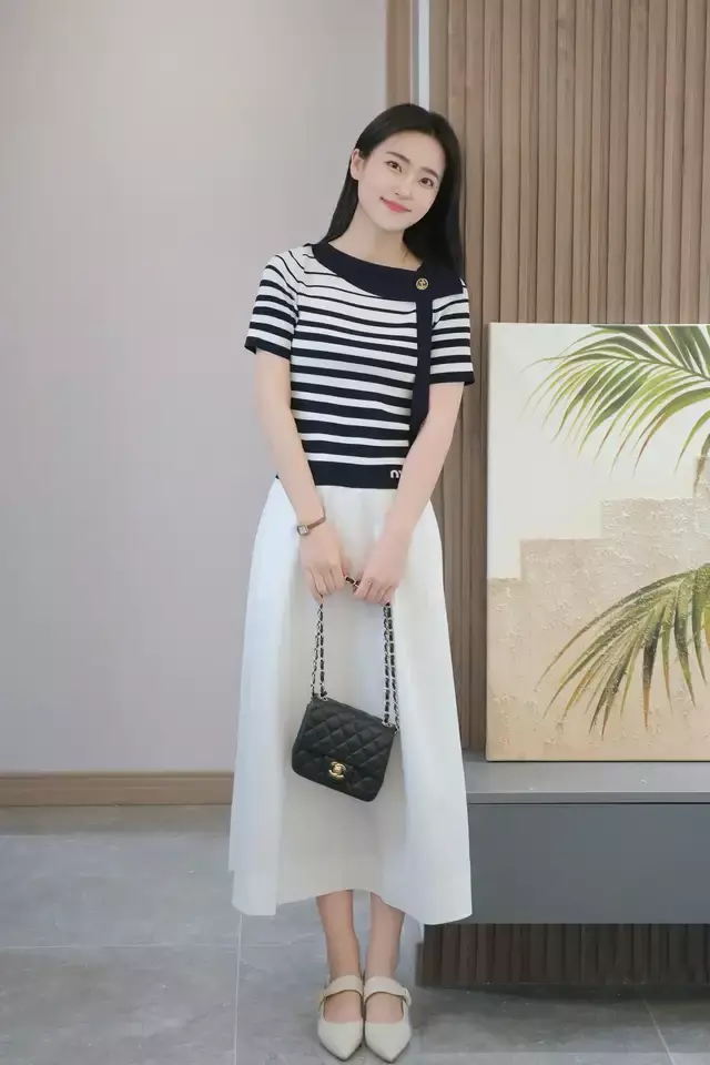 就好比如上面穿的这双白色的浅口低跟单鞋,和白色的散装半身裙结合,一件条纹的针织短袖,这样的打扮多种场合穿搭都适合,不会有任何违和感,也不会显得突兀。